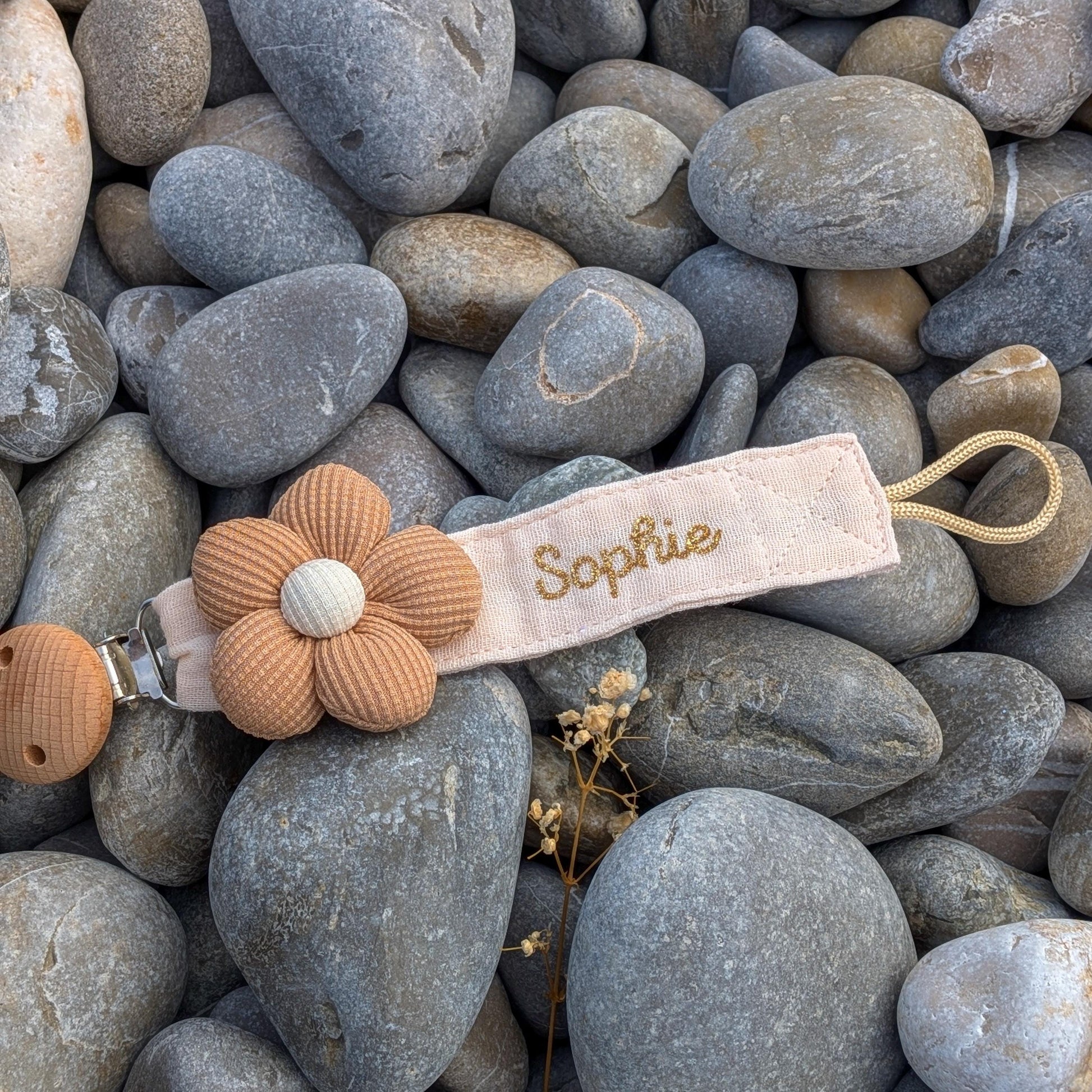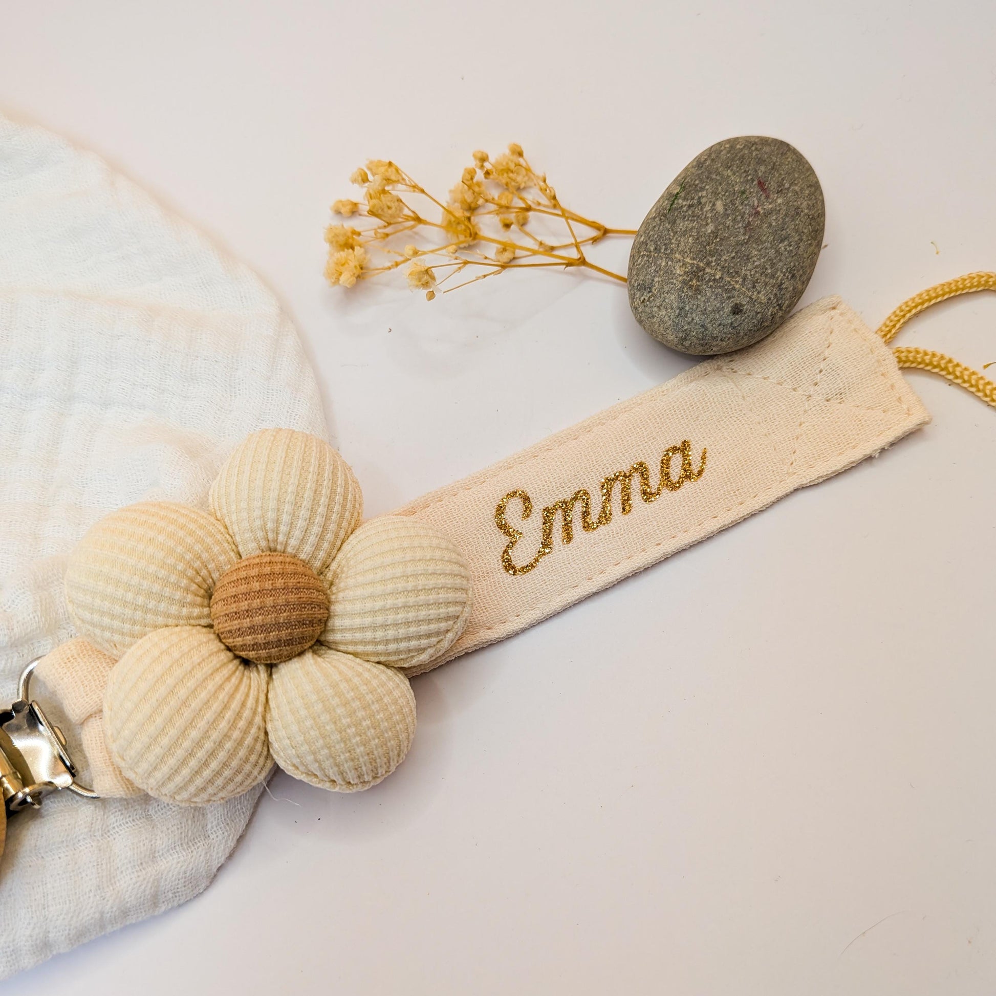 Attache Tétine Personnalisée – Fleur en Gaze de Coton avec Prénom