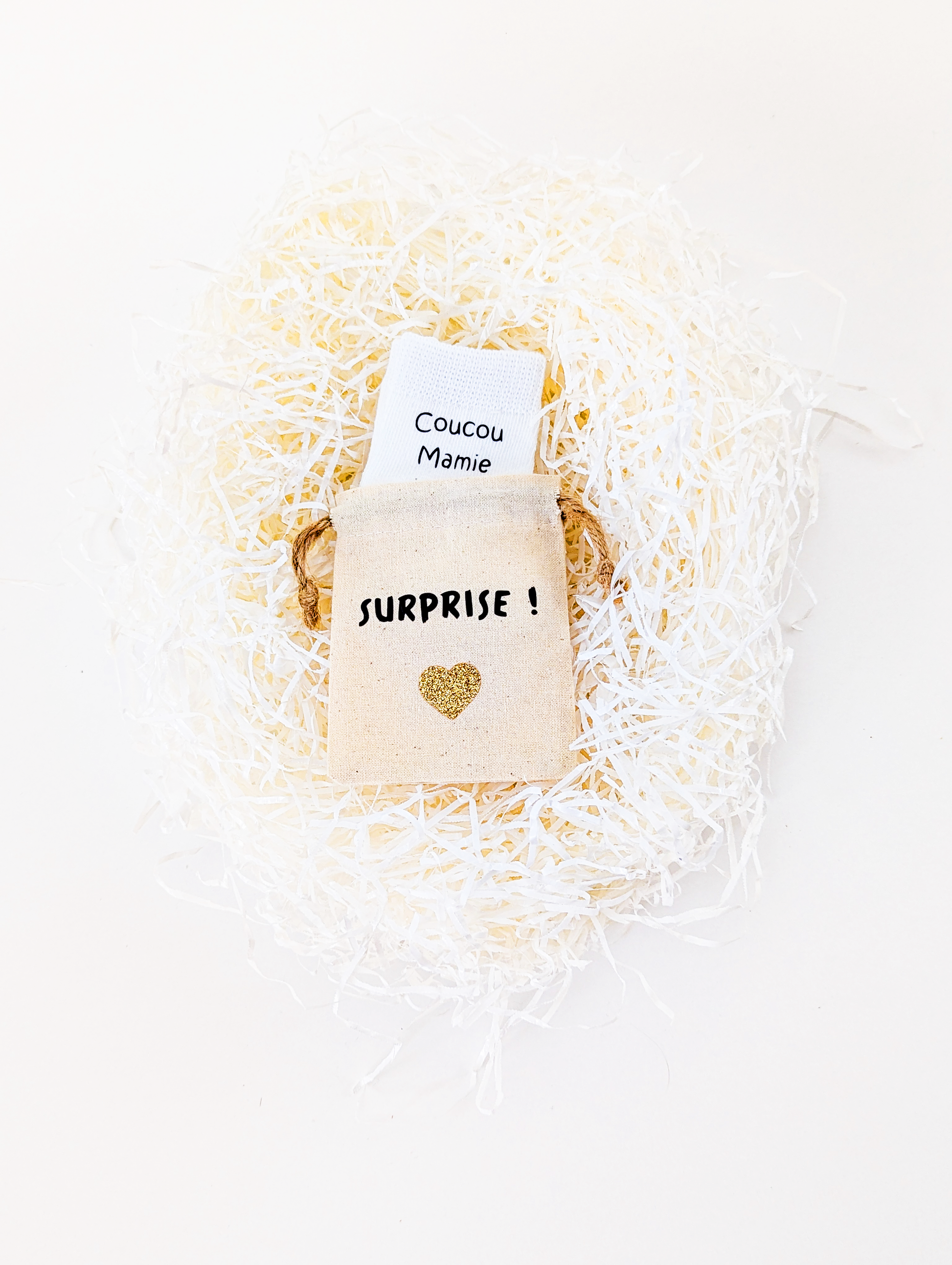 Les chaussette et la pochette sont personnalisées avec du vinyle de qualité. Vous avez le choix entre un motif cœur et bavoir sur les 2 paires.