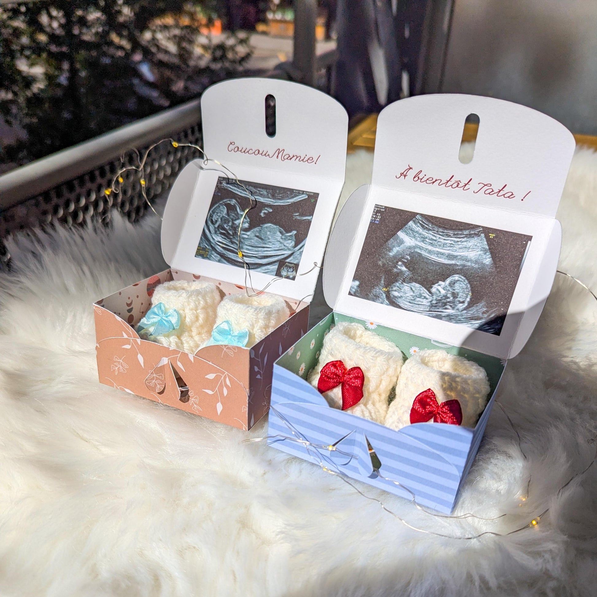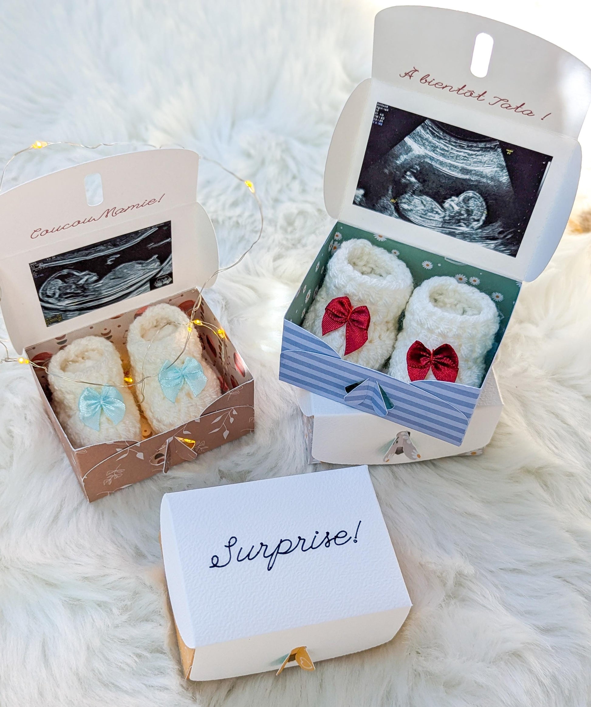 Boîte annonce de grossesse personnalisée – Chaussons miniatures et photo échographie