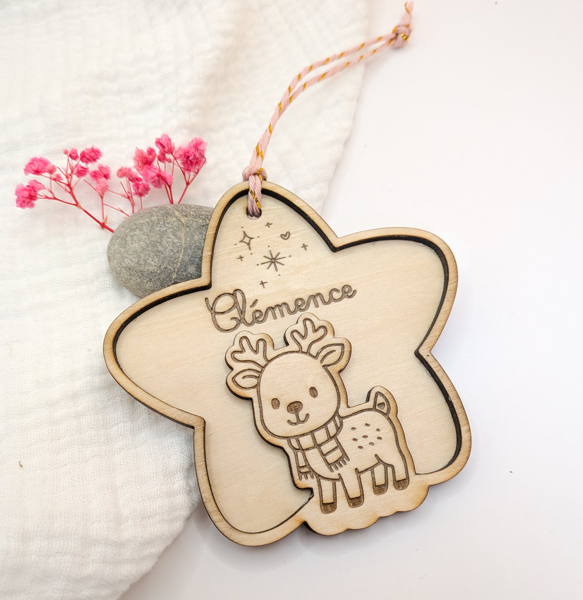 Étoile de Noël Personnalisée en Bois – Décoration de Sapin Gravée pour Enfant