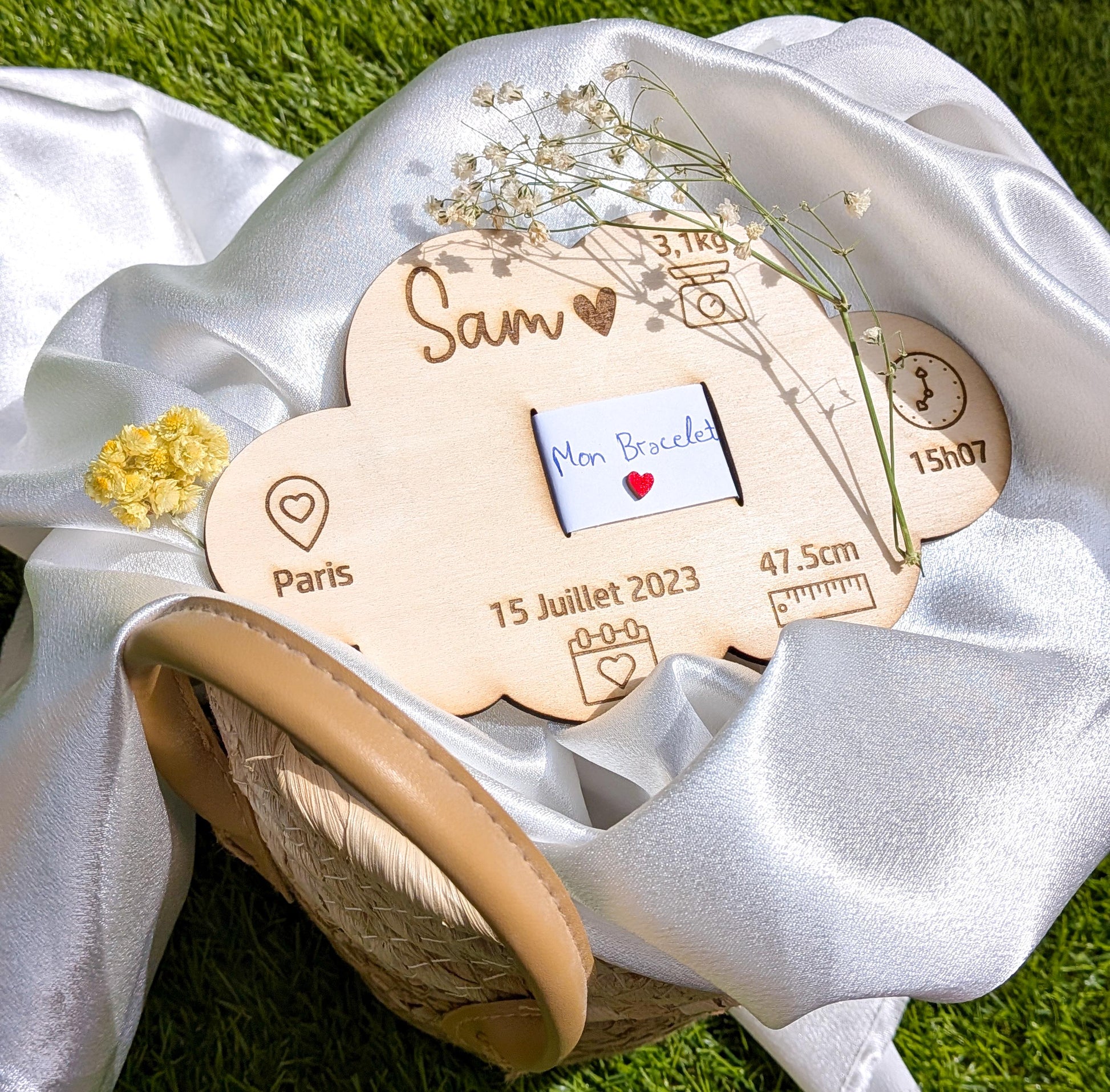 Ce support en bois en forme de nuage est une manière délicate et mémorable de préserver le bracelet de naissance de votre bébé. Chaque pièce est gravée avec soin selon vos souhaits, pour créer un souvenir unique et intemporel ✨